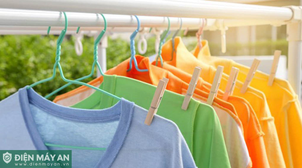 Bạn có thể sử dụng kẹp quần áo, với cách phơi ngược để đón nắng gió tốt hơn. Quần áo được trải ra rộng hơn để hong khô tốt hơn, nên phơi trái quần áo để không bị bạc màu gây hỏng vải.