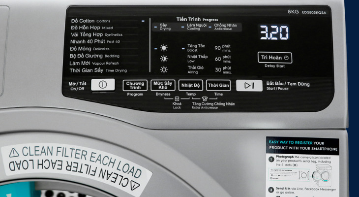 Máy sấy quần áo Electrolux trang bị bảng điều khiển tiếng Việt và tiếng Anh chi tiết, màn hình hiển thị đèn LED với các nút bấm rõ ràng, giúp người dùng dễ dàng quan sát và thao tác.