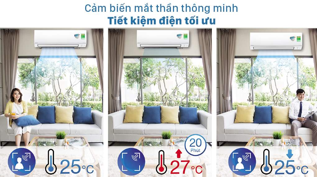 Điều hòa Daikin Inverter 12000 BTU 1 chiều FTKY35WAVMV được tích hợp cảm biến mắt thần thông minh cho phép điều hòa tự động tăng nhiệt độ lên 2 độ C khi phát hiện không có người trong phòng, nhằm tối ưu tiết kiệm điện. Ngược lại, nếu có chuyển động trong phòng máy sẽ tự động quay về chế độ cài đặt ban đầu cho bầu không khí thư giãn như ý muốn.