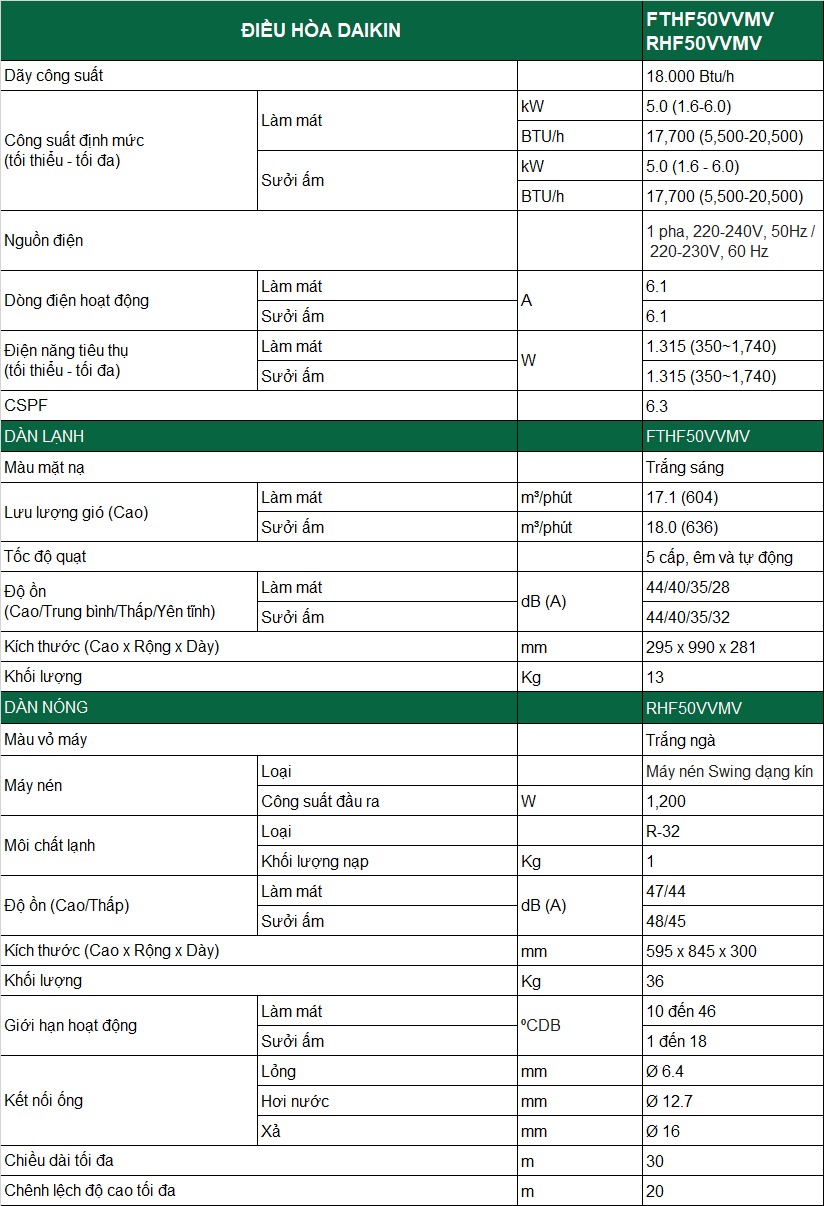 Với công suất 18000BTU, chiếc điều hòa Daikin Inverter 2 chiều FTHF50VVMV này sẽ là lựa chọn rất lý tưởng cho những căn phòng có diện tích từ 20 - 30m2.