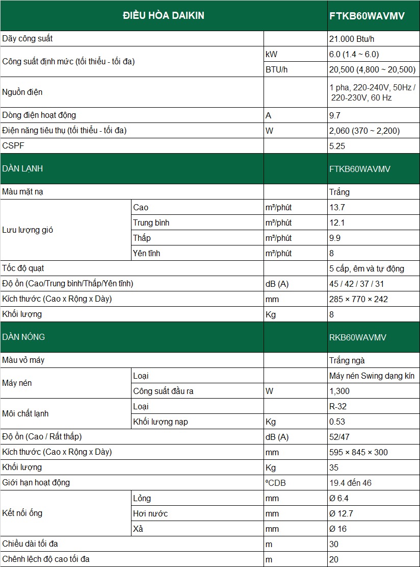 Với công suất 21000BTU, chiếc điều hòa Daikin Inverter 1 chiều FTKB60WAVMV này sẽ là lựa chọn rất lý tưởng cho những căn phòng có diện tích từ 30 - 40m2.
