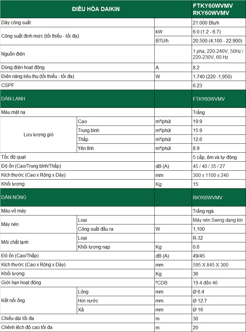 Với công suất 21000BTU, chiếc điều hòa Daikin Inverter 1 chiều FTKY60WVMV này sẽ là lựa chọn rất lý tưởng cho những căn phòng có diện tích từ 30 - 40m2.