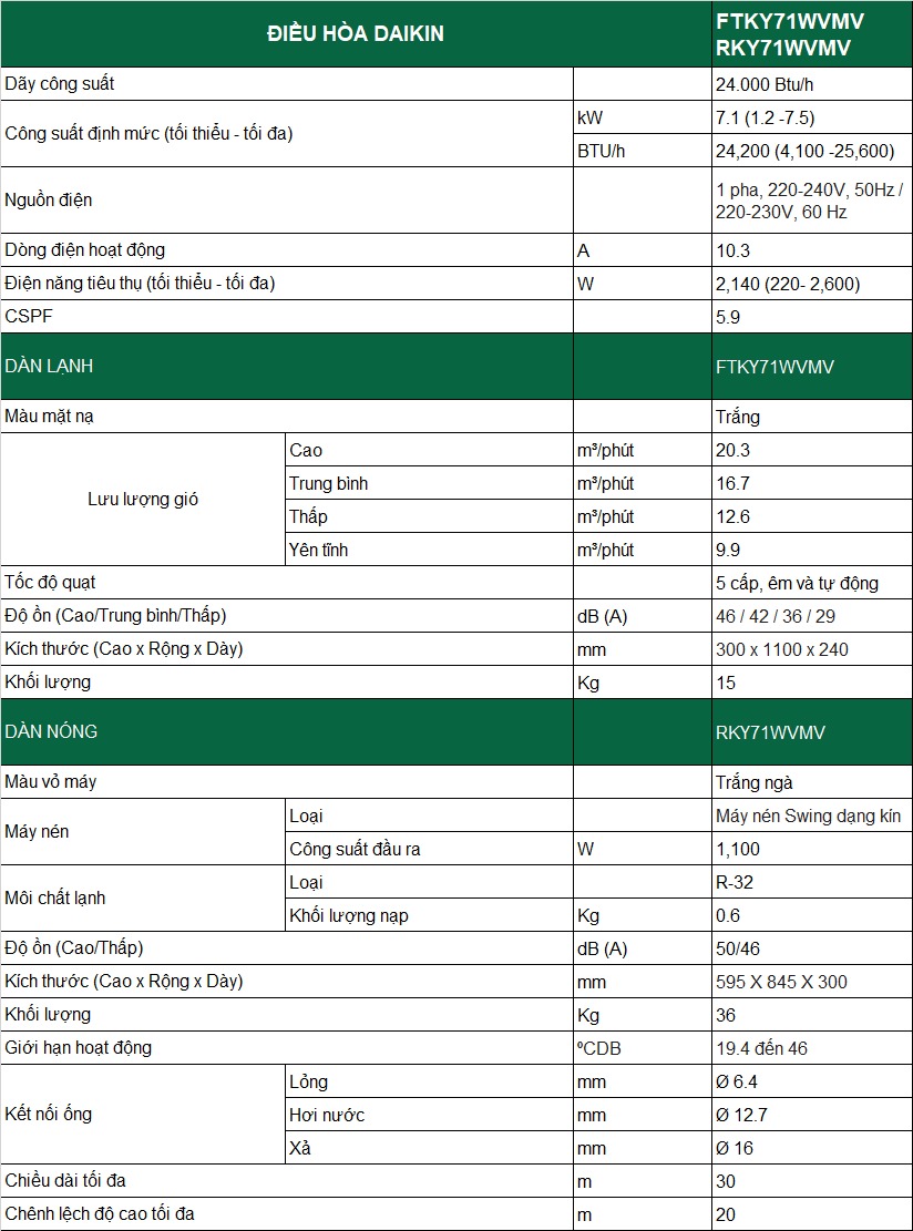 Với công suất 24000BTU, chiếc điều hòa Daikin Inverter 1 chiều FTKY71WVMV này sẽ là lựa chọn rất lý tưởng cho những căn phòng có diện tích từ dưới 45m2.