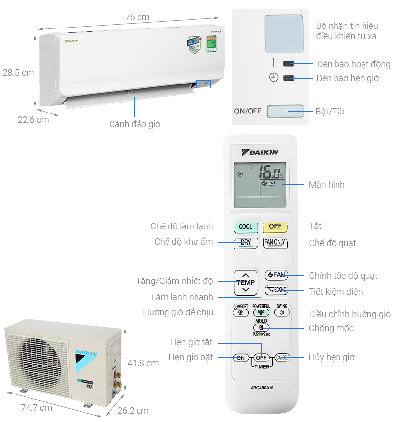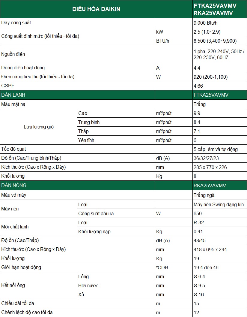Với công suất 9000BTU, chiếc điều hòa Daikin Inverter 1 chiều FTKA25VAVMV này sẽ là lựa chọn rất lý tưởng cho những căn phòng có diện tích dưới 15m2 như phòng ngủ, phòng họp, phòng đọc sách,...