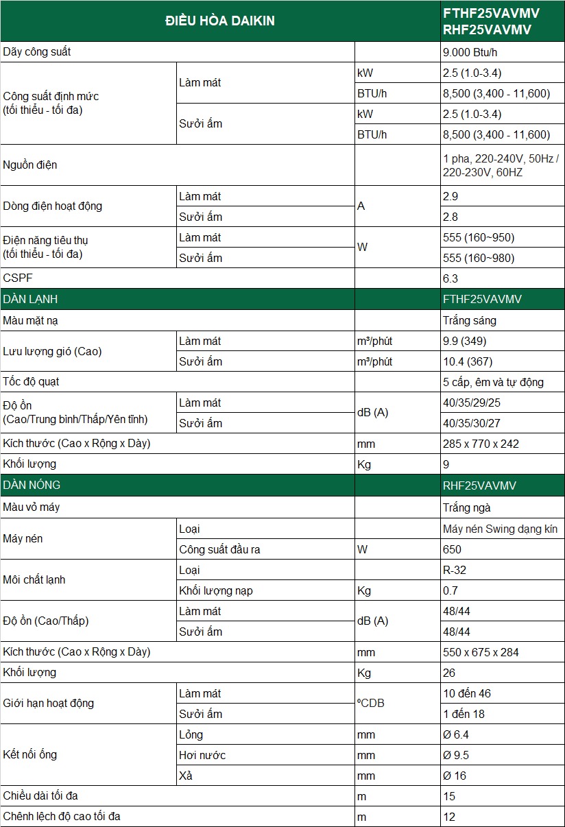 Với công suất 9000BTU, chiếc điều hòa Daikin Inverter 2 chiều FTHF25VAVMV này sẽ là lựa chọn rất lý tưởng cho những căn phòng có diện tích dưới 15m2 như phòng ngủ, phòng họp, phòng đọc sách,...