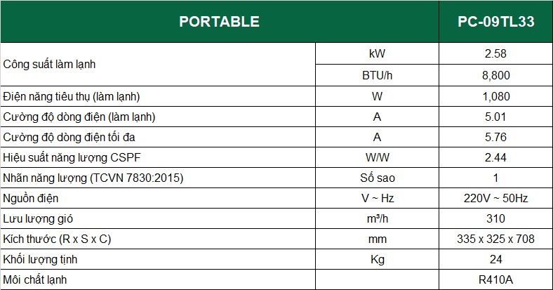 Điều hòa di động Casper 1 chiều 9000BTU PC-09TL33 sử dụng môi chất lạnh R410a tiên tiến thân thiện hơn với môi trường, đem lại hiệu suất làm lạnh cao.