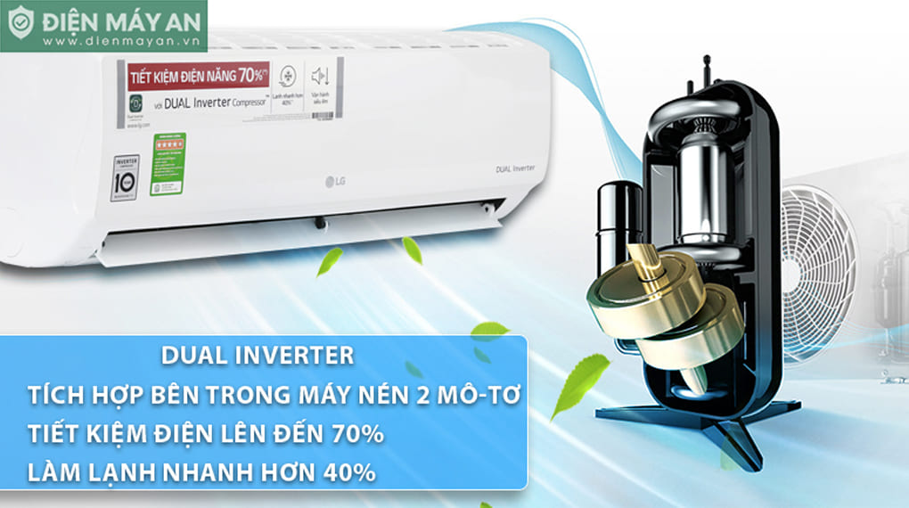 Trang bị công nghệ Dual Inverter tiên tiến, điều hòa LG Inverter 18.000BTU 1 chiều giúp tiết kiệm điện năng vượt trội lên đến 70% so với máy lạnh thông thường, đồng thời làm lạnh nhanh hơn đến 40%. Điều này không chỉ giảm chi phí hóa đơn điện mà còn nâng cao hiệu quả sử dụng lâu dài cho gia đình bạn.