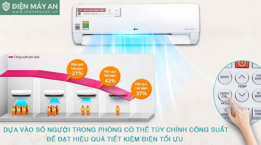 Với chế độ kiểm soát năng lượng chủ động, người dùng có thể lựa chọn mức công suất làm lạnh tùy theo số người trong phòng. Khi chỉ có một người sử dụng, điều hòa LG 18.000BTU 1 chiều có thể giảm tiêu thụ điện năng lên tới 57%, góp phần tiết kiệm đáng kể điện năng tiêu thụ.