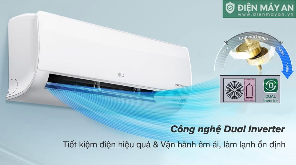 Điều hòa LG sử dụng công nghệ máy nén biến tần kép Dual Inverter giúp tối ưu hiệu quả làm lạnh, ổn định nhiệt độ và tiết kiệm đáng kể năng lượng điện tiêu thụ, đồng thời vận hành êm ái hơn. Công nghệ Energy Ctrl cho phép người dùng chủ động điều chỉnh mức điện năng tiêu thụ với 4 tùy chọn công suất (40%, 60%, 80%, 100%) mà vẫn đảm bảo hiệu quả làm mát. Sản phẩm đạt chuẩn 5 sao nhãn năng lượng với hiệu suất tiêu thụ điện trung bình khoảng 1.84 kW/h.