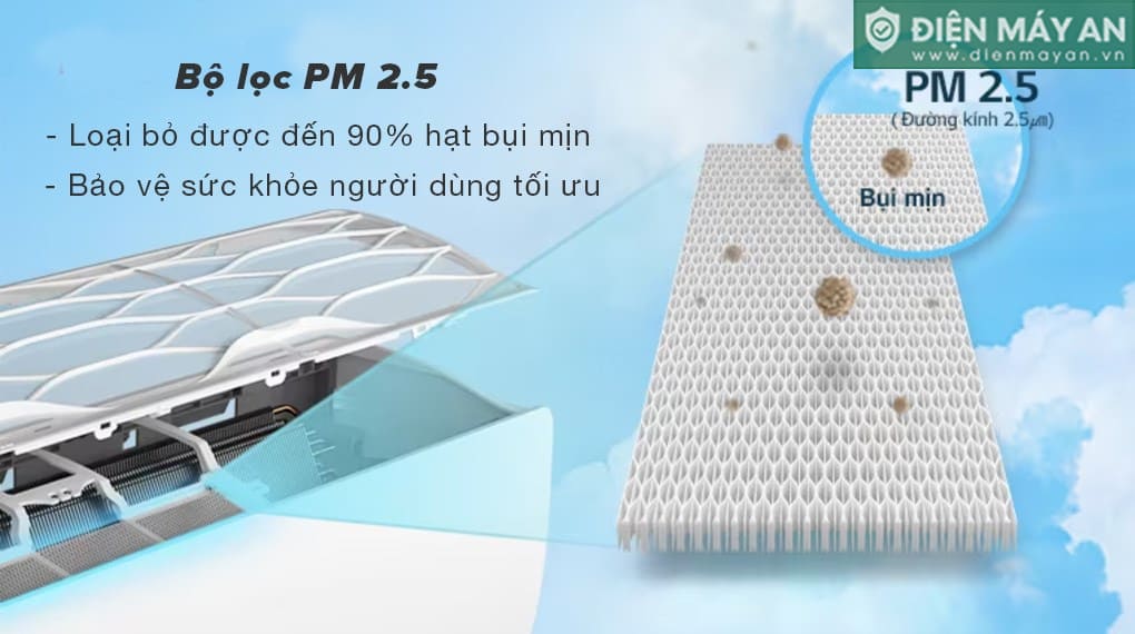 Điều hòa LG Inverter 18.000BTU 1 chiều V18WIN1 được trang bị bộ lọc PM 2.5 hiệu quả loại bỏ tới 90% hạt bụi mịn, góp phần bảo vệ toàn diện sức khỏe hệ hô hấp cho bạn và gia đình. Ngoài ra, màng lọc sơ cấp cũng hỗ trợ giữ lại các hạt bụi lớn ngay từ bước lọc đầu tiên, tạo ra không gian sống trong lành và thoải mái hơn.