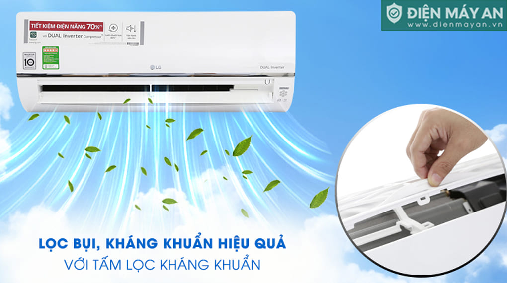 Điều hòa LG Inverter 9000 BTU được trang bị bộ tạo ion, giúp lọc sạch không khí, loại bỏ bụi bẩn, vi khuẩn và các tác nhân gây dị ứng, bảo vệ sức khỏe cho các thành viên trong gia đình.