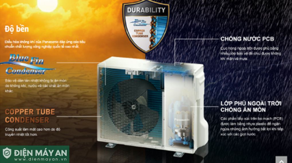 Điều hòa Panasonic CU/CS-N12ZKH-8 mang đến độ bền bỉ về chất lượng với dàn tản nhiệt cục nóng phủ lớp màu xanh blue fin chống ăn mòn bởi hơi mặn và nước mưa. Điều hoà Panasonic khằng định vị thế vững chắc trong lòng người tiêu dùng Việt Nam với quy trình kiểm tra nghiệm ngặt về độ bền của máy trước khi đưa ra thị trường, bởi thế mà chiếc điều hoà CU/CS-N12ZKH-8 luôn là những model bán chạy hiện nay.