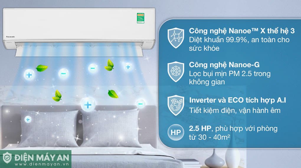 - Công nghệ lọc không khí Nanoe™ X độc quyền của Panasonic, lọc sạch bầu không khí, với khả năng giải phóng ra các phân tử Nanoe X có kích thước siêu nhỏ để ức chế sự phát triển của vi khuẩn và virus đến 99%, đồng thời loại bỏ các chất gây dị ứng và mùi hôi tối ưu, giúp cho bầu không khí luôn trong lành, an toàn cho sức khoẻ.