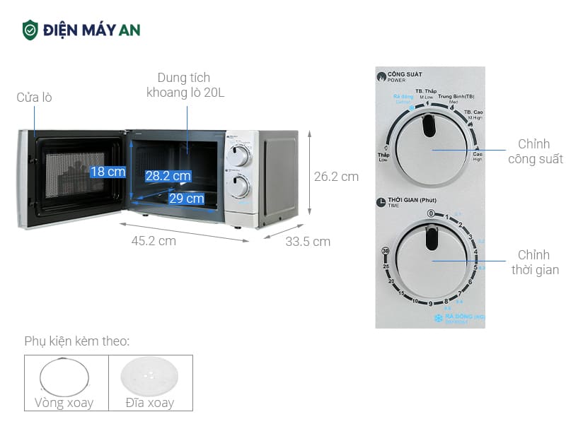 - Bảng điều khiển gồm nút xoay điều chỉnh công suất và hẹn giờ trực quan, giúp bạn dễ dàng tùy chỉnh từ 6 mức công suất đến 30 phút hẹn giờ, phù hợp với nhiều loại thực phẩm khác nhau. Thiết kế này vừa thân thiện với người dùng, vừa giúp tiết kiệm thời gian khi chuẩn bị bữa ăn.