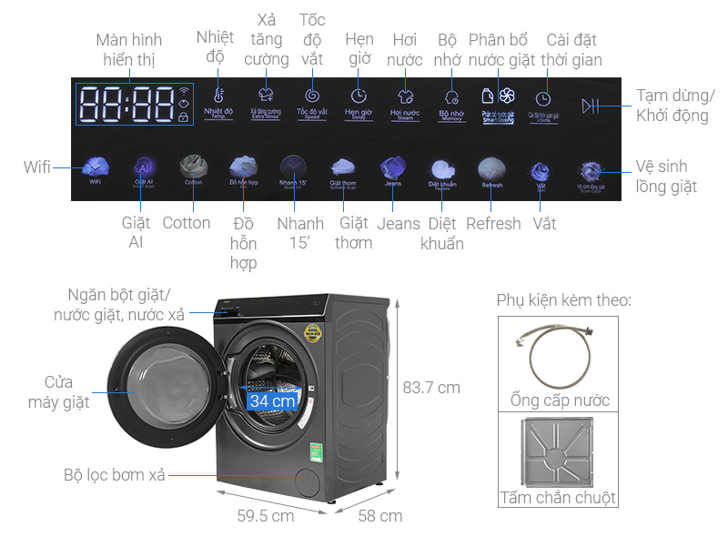- Hẹn giờ giặt: Cài sẵn thời gian giặt theo nhu cầu, tranh tình trạng mùi hôi khi quên lấy quần áo ra.