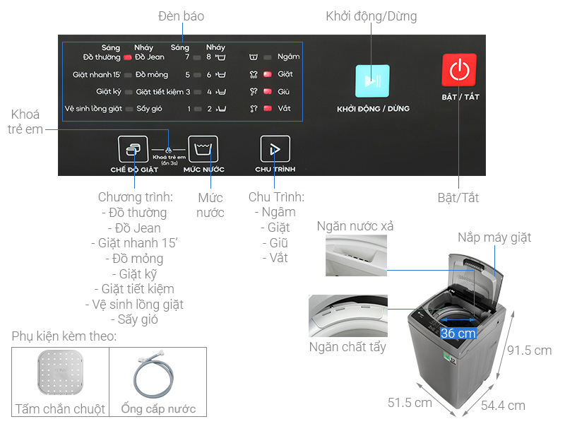 - Khóa trẻ em: tính năng này khóa các phím chức năng trên máy giặt để tránh trẻ em can thiệp vào quá trình vận hành.