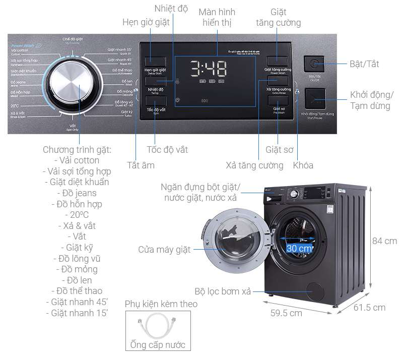 | Bảng điều khiển: | Song ngữ Anh - Việt, có nút xoay, màn hình hiển thị |