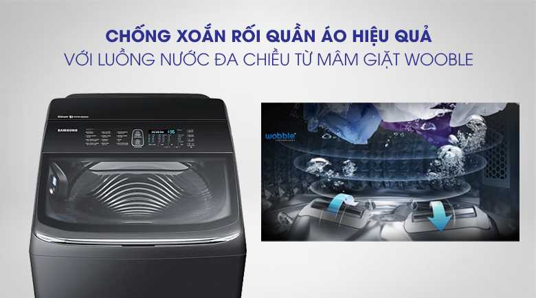 Máy giặt Samsung inverter 22 kg WA22R8870GV/SV được sở hữu công nghệ Wobble sẽ chăm sóc sợi vải một cách nhẹ nhàng mà vẫn không ảnh hưởng đến hiệu suất giặt quần áo. Nhờ mâm giặt có hai gờ và hai trục xoay tạo ra dòng nước mạnh mẽ chuyển động lên xuống và xoay ngang, giữ cho quần áo không bị xoắn và tăng cường thêm sức mạnh giặt tẩy.