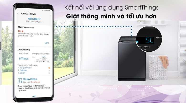 Máy giặt cửa trên 22kg WA22R8870GV/SV có thể kết nối dễ dàng với điện thoại thông qua ứng dụng SmartThings, người dùng có thể điều khiển máy giặt nhanh chóng và tối ưu hơn. Dễ dàng giám sát được thiết bị từ xa và kịp thời khắc phục khi gặp sự cố với trình giám sát thông minh.