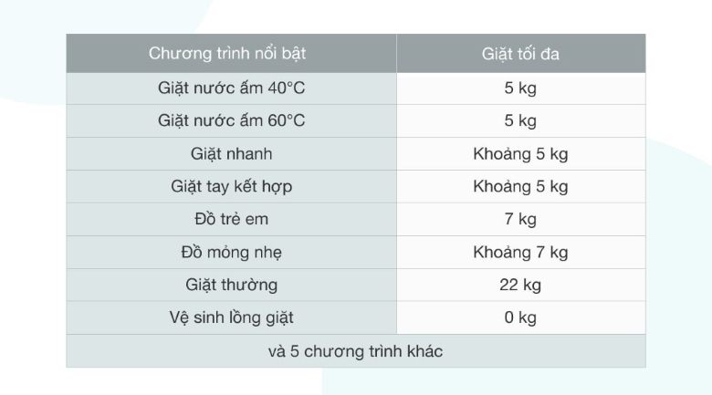 Máy giặt Samsung Inverter 22 kg WA22R8870GV/SV có 8 chu trình giặt nổi bật như: Giặt nước ấm 40°C, giặt nước ấm 60°C, giặt nhanh, giặt tay kết hợp, đồ trẻ em, giặt thường, đồ mỏng nhẹ, vệ sinh lồng giặt cùng 5 chương trình giặt khác tiện lợi cho người dùng (Xem chi tiết tại bảng thông số kỹ thuật). Trong đó có chế độ giặt nhanh giúp tối ưu thời gian giặt với khối lượng giặt lên đến 5 kg.