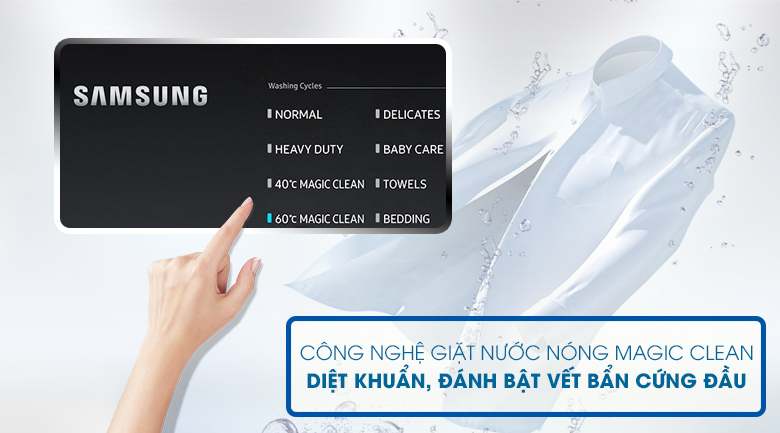 Công nghệ Magic Clean trên máy giặt WA22R8870GV/SV có thể tùy chỉnh linh hoạt chương trình giặt giũ ở mức 40°C cho những vết bẩn thông thường hằng ngày, hay 60°C cho những mảng bám dai dẳng và cứng đầu nhất, giúp quần áo được giặt sạch hoàn hảo.