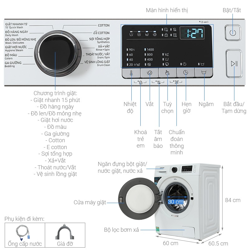 | Bảng điều khiển: | Song ngữ Anh - Việt, có nút xoay, màn hình hiển thị |