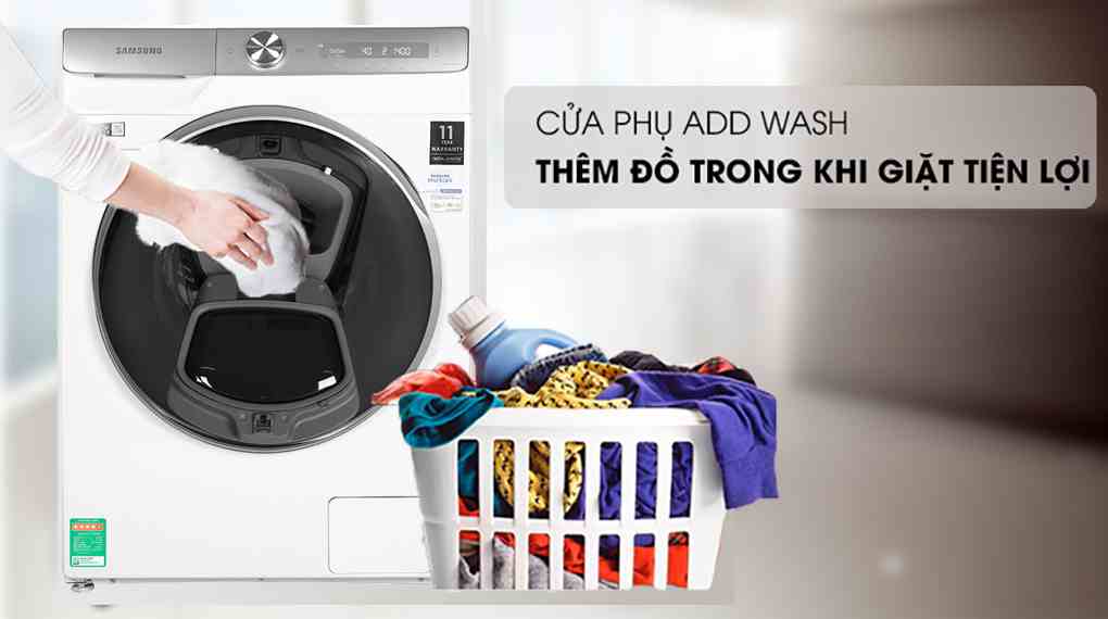 Nếu là người hay quên, gom đồ đi giặt hay bị sót, thì bạn sẽ chắc chắn phải hài lòng với chiếc máy giặt cửa trước này vì nó được trang bị cửa phụ Add Wash, một điểm nổi bật của máy giặt Samsung lồng ngang. Với cửa phụ này bạn có thể thêm đồ sót, nước xả, nước giặt vào bất cứ khi nào.