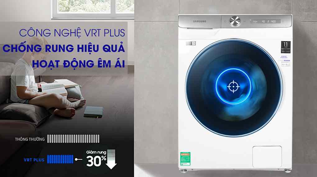 Chiếc máy giặt lồng ngang Samsung 9kg WW90TP54DSH/SV này được trang bị công nghệ VRT Plus™ có khả năng cảm biến được mức độ rung lắc của lồng giặt khi hoạt động, từ đó tự điều chỉnh lại để giảm bớt độ rung ồn với hiệu suất lên đến 30% cũng như tối ưu hóa quá trình vận hành của động cơ máy giặt.