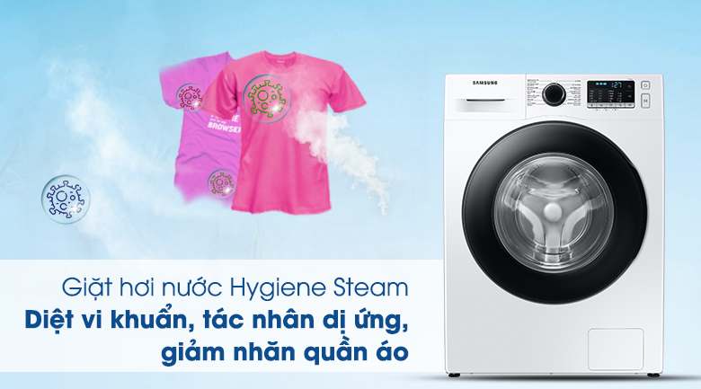 Máy giặt cửa trước Samsung WW90TP54DSH/SV sở hữu chế độ giặt hơi nước Hygiene Steam giúp nước giặt thấm sâu vào từng sợi vải để loại bỏ cặn bẩn bám sâu và diệt tới 99,9% vi khuẩn và các tác nhân gây dị ứng, bảo vệ sức khỏe cho bạn và cả gia đình.