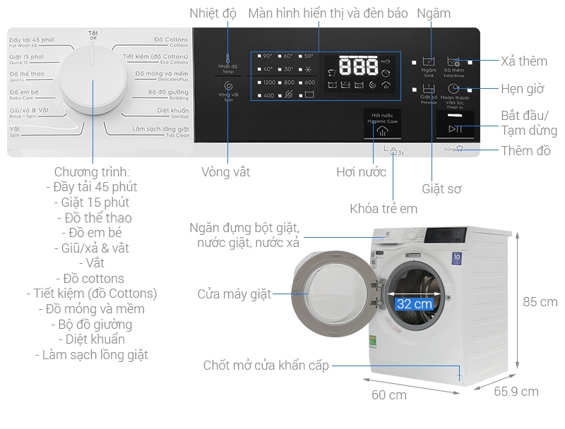 - Khóa trẻ em an toàn, đảm bảo các chức năng chương trình đều được khoá khi máy chạy, trẻ nhỏ không thể nghịch phá hay vô tình bấm nhầm nút trên bảng điều khiển được.