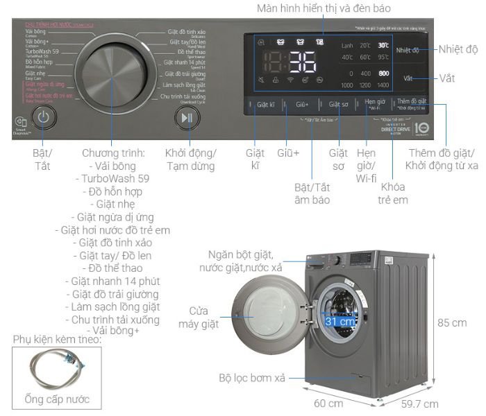 - Tính năng Smart Diagnosis cũng giúp chẩn đoán lỗi tự động, hỗ trợ người dùng xử lý nhanh chóng khi gặp sự cố. Ngoài ra, máy còn có chức năng thêm đồ khi đang giặt, hẹn giờ giặt linh hoạt, giúp bạn hoàn toàn chủ động trong mọi thời điểm.