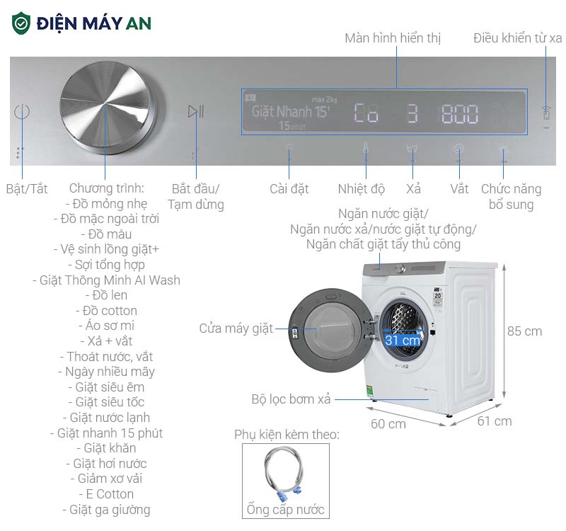- Được tích hợp sẵn 21 chương trình hoạt động với các chu trình giặt nhanh 15 phút, giặt siêu êm, đến giặt vải cotton, đồ len, áo sơ mi… đa dạng với các chất liệu vải để mang đến hiệu quả cao mà vẫn bảo vệ tốt sợi vải được bền màu.