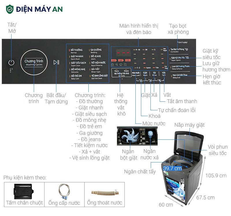 - Máy giặt Inverter WA10CG5745BDSV đạt nhãn năng lượng 5 sao với hiệu suất điện sử dụng khoảng 5.92 Wh/kg.