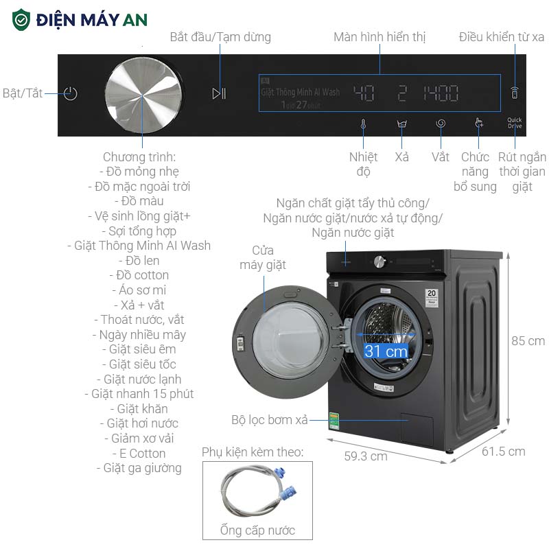 - Bảng điều khiển WW12CB944DGBSV với 2 ngôn ngữ tiếng Anh - Việt với núm xoay dễ điều chỉnh chương trình cùng màn hình LED hiển thị dễ hiểu với nút chạm cảm ứng dễ dàng thao tác cho cả gia đình mỗi khi sử dụng. Đặc biệt, bảng điều khiển thông minh AI Control có khả năng ghi nhớ, phân tích và đề xuất chế độ giặt phù hợp, thậm chí còn cài đặt chương trình yêu thích.