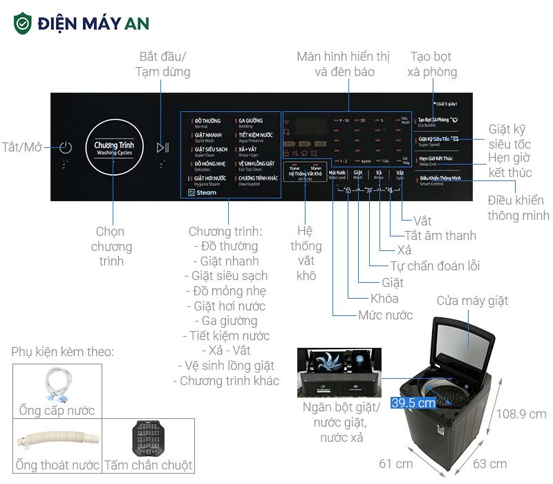 - Nhãn năng lượng: 5 sao. Hiệu suất sử dụng điện 5.09 Wh/kg.