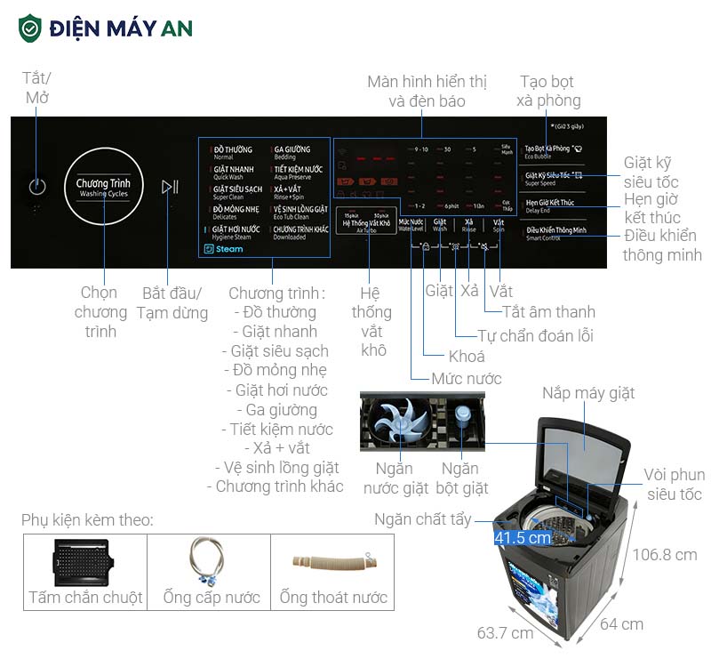 - Bộ lọc xơ vải Magic Filter: Mang đến cho gia đình những bộ quần áo sáng bóng, sạch đẹp, bởi cơ chế từ bộ lóc được đặt dưới dòng nước và các xơ cải sẽ được giữ lại, người dùng có thể tháo xả xơ vải ra bền ngoài khi bộ lọc đã đầy rất đơn giản.
