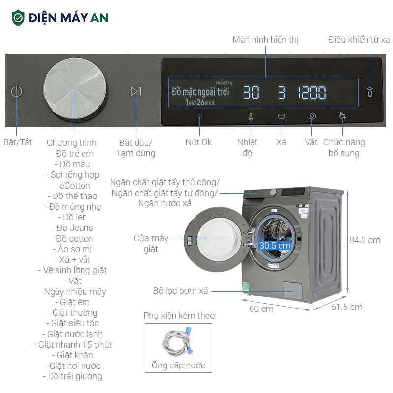 - Với việc trang bị bảng điều khiển AI Control cùng màn hình hiển thị rõ nét, giúp người dùng dễ sử dụng, cùng với đó là khả năng ghi nhớ, để phân tích và đề xuất chế độ giặt phù hợp, giúp người dùng tối ưu việc giặt giũ quần áo trở nên hiệu quả hơn.