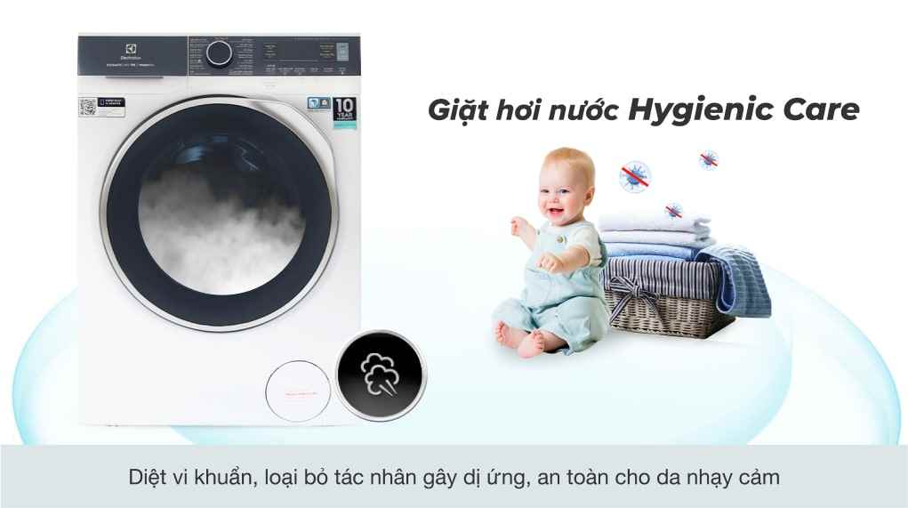 Máy giặt Electrolux Inverter EWW1142Q7WB sử dụng công nghệ hơi nước Hygienic Care, có thể loại bỏ được đến 99.9% vi khuẩn cũng như các tác nhân khác gây dị ứng cho da, phù hợp với những gia đình có trẻ nhỏ, người lớn tuổi hoặc những đối tượng có sức khỏe làn da nhạy cảm nói chung.