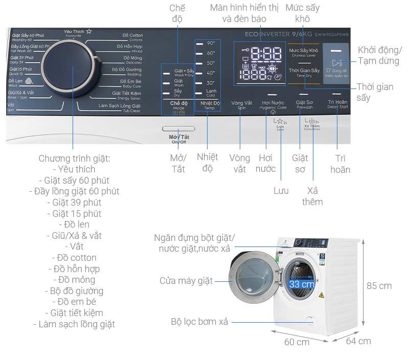 | Khối lượng giặt: | Giặt 9 kg - Sấy 6 kg |