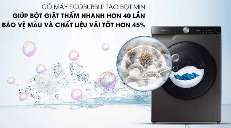 EcoBubble loại bỏ những vết bẩn khỏi áo quần hiệu quả hơn 24%, hạn chế tối đa hư tổn, bảo vệ áo quần tốt hơn 45%, và tiết kiệm đến 70% điện năng, hạn chế khả năng đóng cặn trong máy giặt.