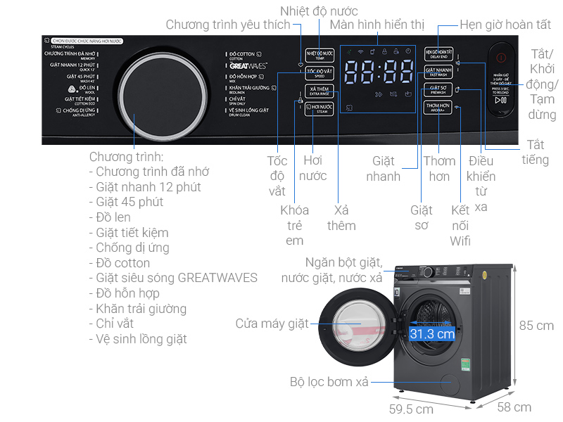 - Đặc biệt, Máy giặt còn có Great Steam – hơi nước nóng giúp diệt khuẩn, khử mùi, giảm nhăn, thích hợp cho quần áo trẻ em hoặc làn da nhạy cảm.