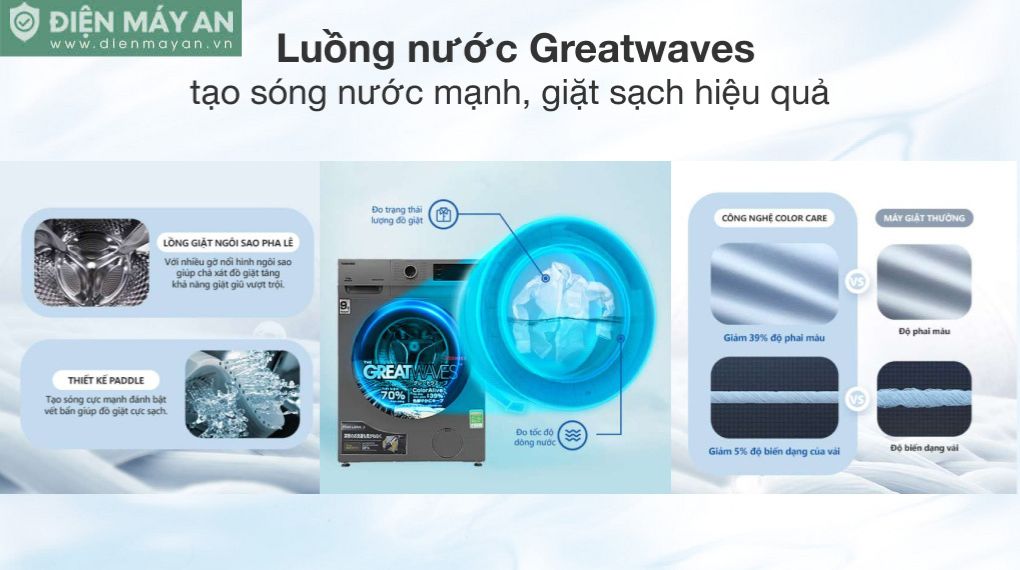 - Công nghệ Flush Waves: Tạo sóng nước cực mạnh để đẩy nhanh vết bẩn.