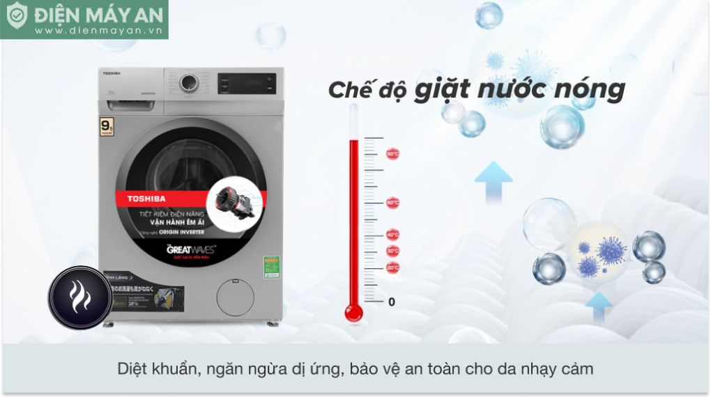 Công nghệ nước nóng từ mẫu máy giặt Toshiba TW-BK105S3V(SK) rất phù hợp cho gia đình có trẻ nhỏ hoặc người có làn da nhạy cảm. Bởi đặc trưng nước nóng sẽ làm tiêu diệt vi khuẩn nhanh chóng hơn nhờ đó mà khi sử dụng máy giặt với tính năng công nghệ nước nóng sẽ đảm bảo hiệu quả cho quần áo sạch nhanh và diệt khuẩn tốt hơn