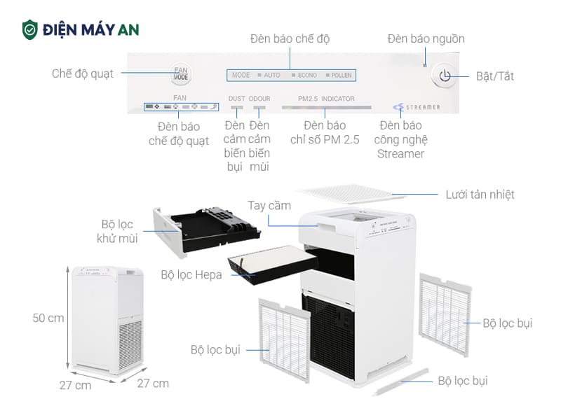 Máy được thiết kế 3 cửa hút gió (trước – trái – phải) giúp thu hút một lượng lớn không khí bẩn, nhanh chóng đưa qua hệ thống lọc bụi, khử mùi và Streamer để trả lại luồng khí sạch.