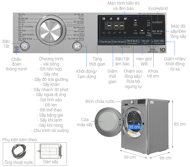 Máy cài sẵn các lựa chọn như sấy nhanh 30 phút, sấy chống dị ứng, sấy bằng giá, khí lạnh, khí nóng…, giúp bạn linh hoạt tùy chỉnh theo chất liệu vải.