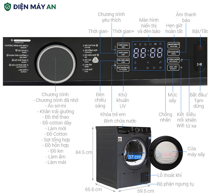 Thiết bị được trang bị 12 chương trình sấy chuyên biệt như: Sấy đồ cotton, đồ len, thể thao, sơ mi, chăn ga, đồ hỗn hợp... Mỗi chế độ đều được thiết kế riêng biệt để tối ưu thời gian và nhiệt độ, đảm bảo quần áo luôn khô nhanh mà vẫn được bảo vệ tối đa sợi vải.
