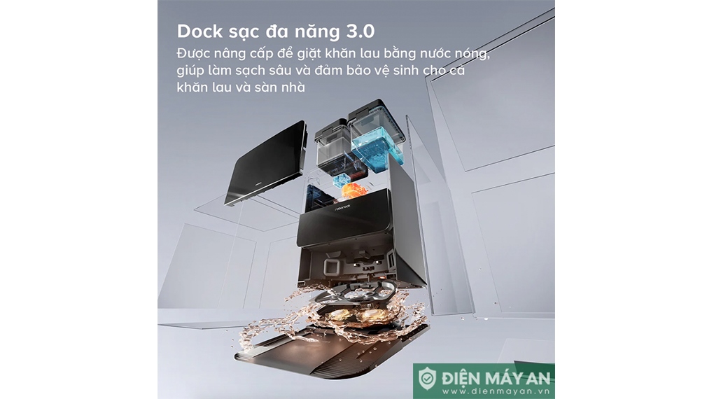 - Trạm sạc của robot hút bụi Roborock Saros 10R còn có công nghệ tự làm sạch bằng nước nóng, giúp loại bỏ vi khuẩn tốt hơn.