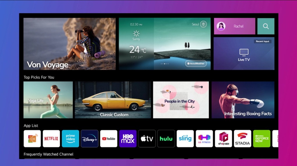 Smart Tivi OLED LG thiết lập hệ điều hành webOS 22 trực quan thân thiện, dễ sử dụng, tích hợp kho ứng dụng đa dạng như FPT Play, YouTube, Galaxy Play (Fim+), Clip TV, MyTV, POPS Kids, Netflix, Spotify,... đáp ứng nhu cầu giải trí.