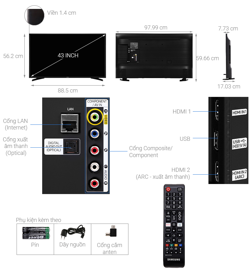 | Cổng nhận hình ảnh, âm thanh: | 2 cổng HDMI có 1 cổng HDMI ARC, 1 cổng Composite, 1 cổng Component |