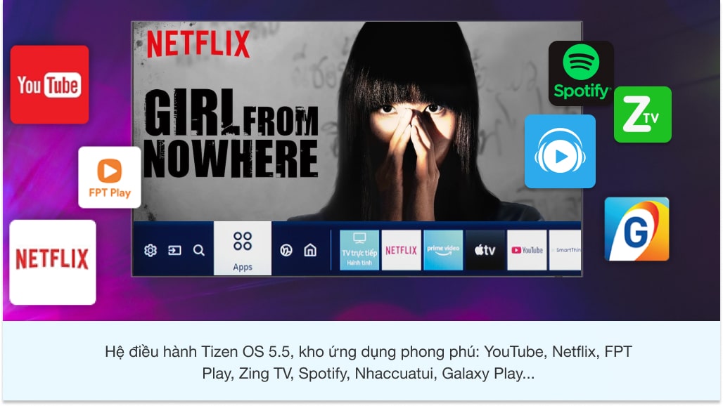 Đáp ứng nhu cầu giải trí cơ bản của bạn và gia đình cùng các ứng dụng được cài sẵn như: trình duyệt web, YouTube, Netflix,... Ngoài ra, bạn có thể tải thêm các ứng dụng khác như: Spotify, FPT Play, Galaxy Play (Film+),...
